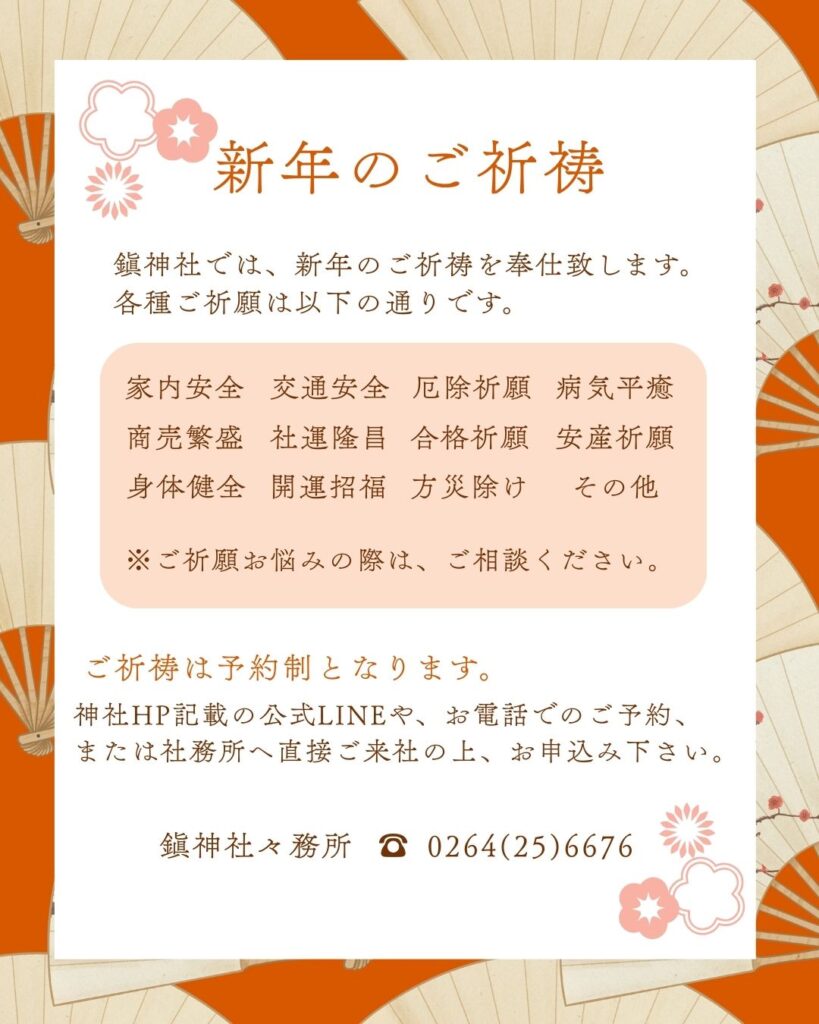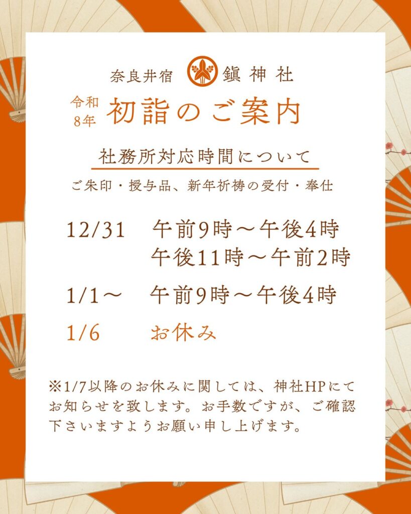 初詣のご案内 2025 12/30 お知らせ 2025年12月30日 本年も残すところあとわずかとなりました。たくさんの方にお参りいただき、心より感謝申し上げます。 当社の初詣につきましては下記の通りとなります。三が日は冷え込みが予想されます。皆様暖かい恰好でお参りください。 お知らせ 七五三詣について 関連記事 七五三詣について 2025年9月18日 参拝・祈祷について 2025年4月1日 ご挨拶 2025年4月1日